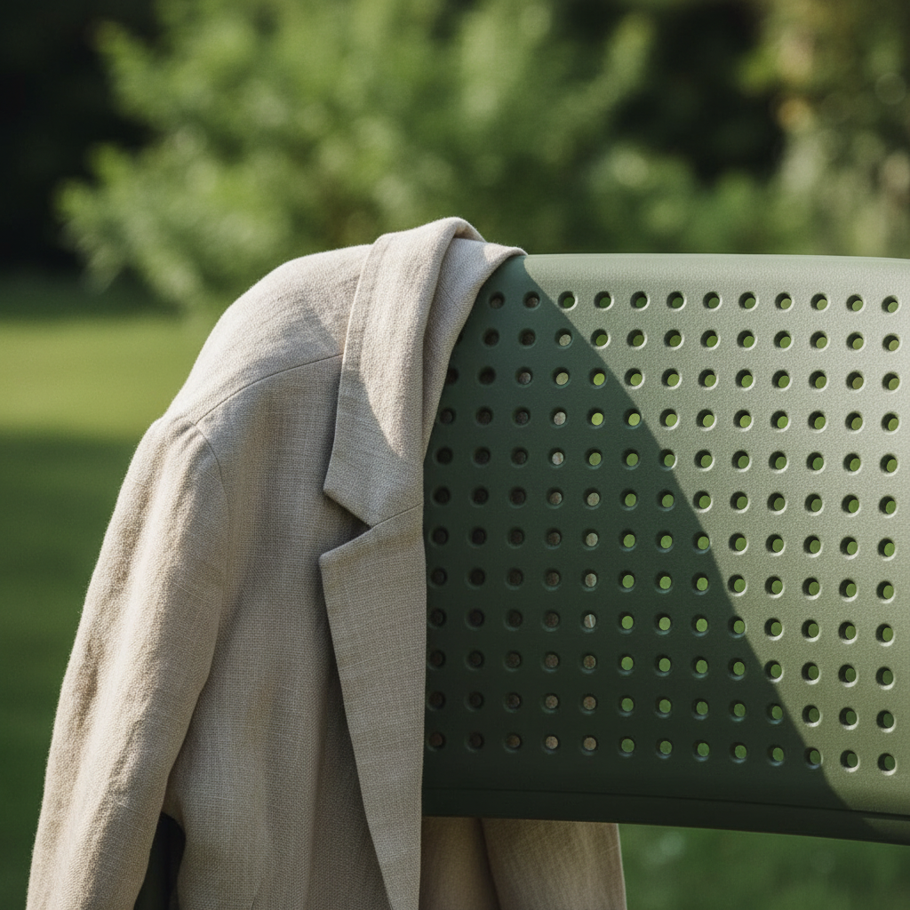 Pulire regolarmente con acqua tiepida e sapone neutro, utilizzando una spugna morbida non abrasiva. Evitare solventi chimici aggressivi che potrebbero danneggiare il trattamento anti-UV e la resina riciclabile. Asciugare con panno morbido dopo la pioggia per prevenire accumuli di calcare. Grazie alla struttura impilabile, è possibile riporre più sedie in spazi ridotti durante i mesi invernali, anche se il materiale resiste alle basse temperature e può rimanere all'aperto tutto l'anno senza deteriorarsi.