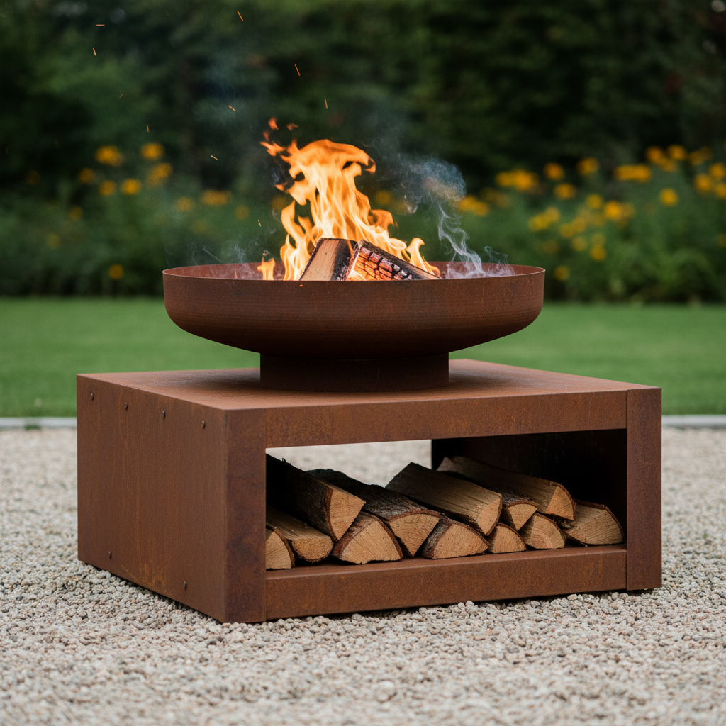 Rimuovere la cenere a freddo dopo ogni utilizzo. Pulire la struttura in acciaio con panno asciutto; evitare spugne abrasive e detergenti aggressivi. L'ossidazione superficiale è parte dell'estetica del prodotto. Svuotare il portalegna e coprire con telo impermeabile in inverno, o riporre al coperto per rallentare la corrosione profonda.