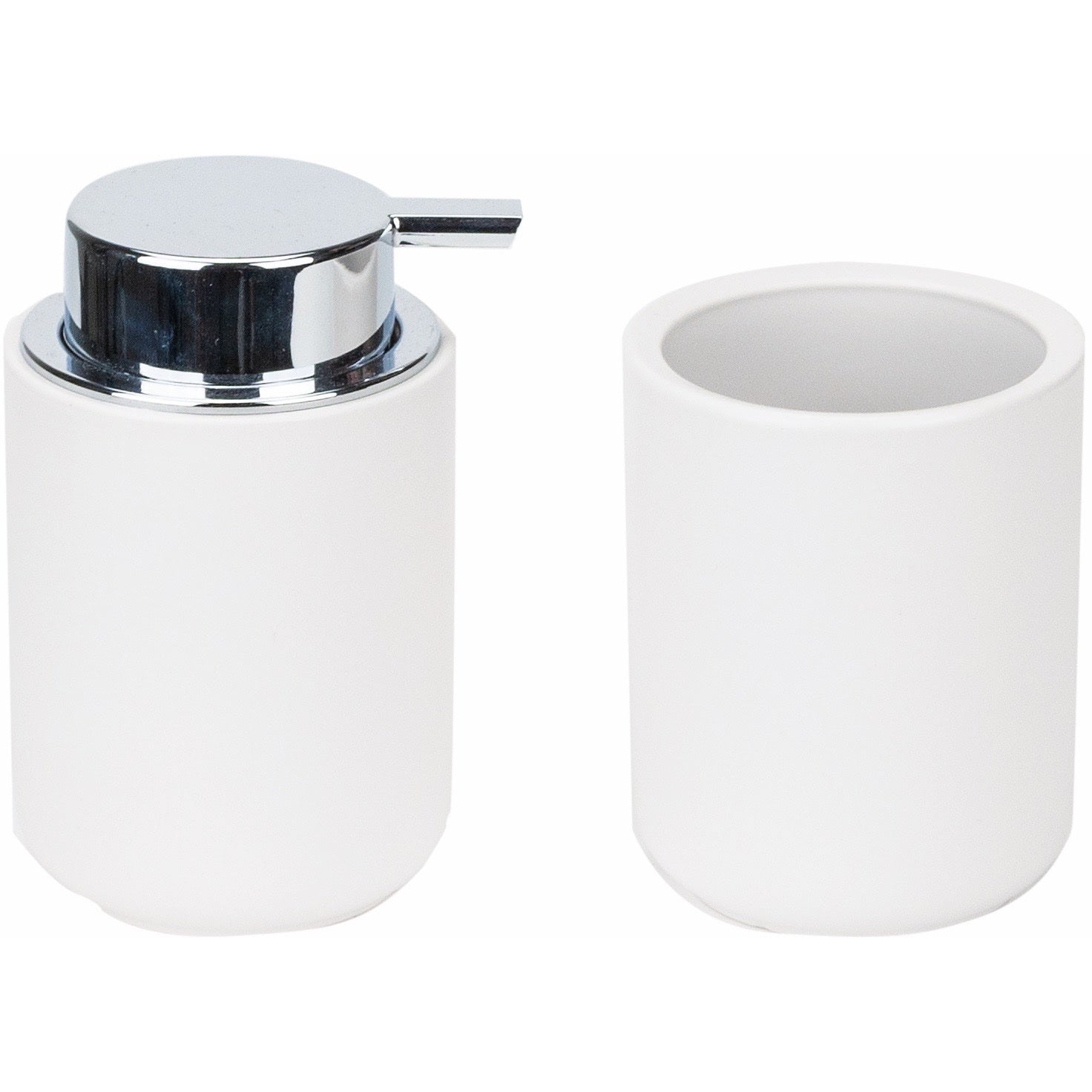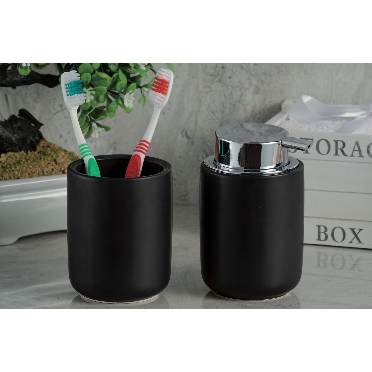 Er ist aus hochwertiger Keramik gefertigt und garantiert Widerstandsfähigkeit und Langlebigkeit, wobei er stets ein gepflegtes Erscheinungsbild bewahrt. Der Spender ist mit einem Auslauf in Chromoptik ausgestattet, ideal für den praktischen und hygienischen täglichen Gebrauch, während der Becher sich perfekt für Zahnbürsten, Accessoires oder kleine Gegenstände eignet. Die matte Oberfläche und die modernen Farben machen ihn zu einem vielseitigen Einrichtungsaccessoire, das sich mühelos in verschiedene Einrichtungsstile einfügt.