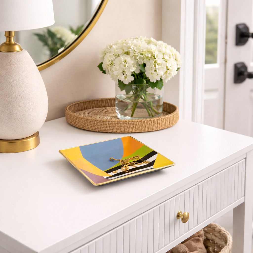 La forma quadrata con bordo color oro dona raffinatezza e luminosità, rendendolo perfetto sia come accessorio funzionale sia come oggetto decorativo. Con dimensione 24 cm, è ideale per essere posizionato su consolle, tavoli, ingressi, scrivanie o madie, dove può essere utilizzato per riporre chiavi, piccoli oggetti, gioielli o accessori quotidiani.