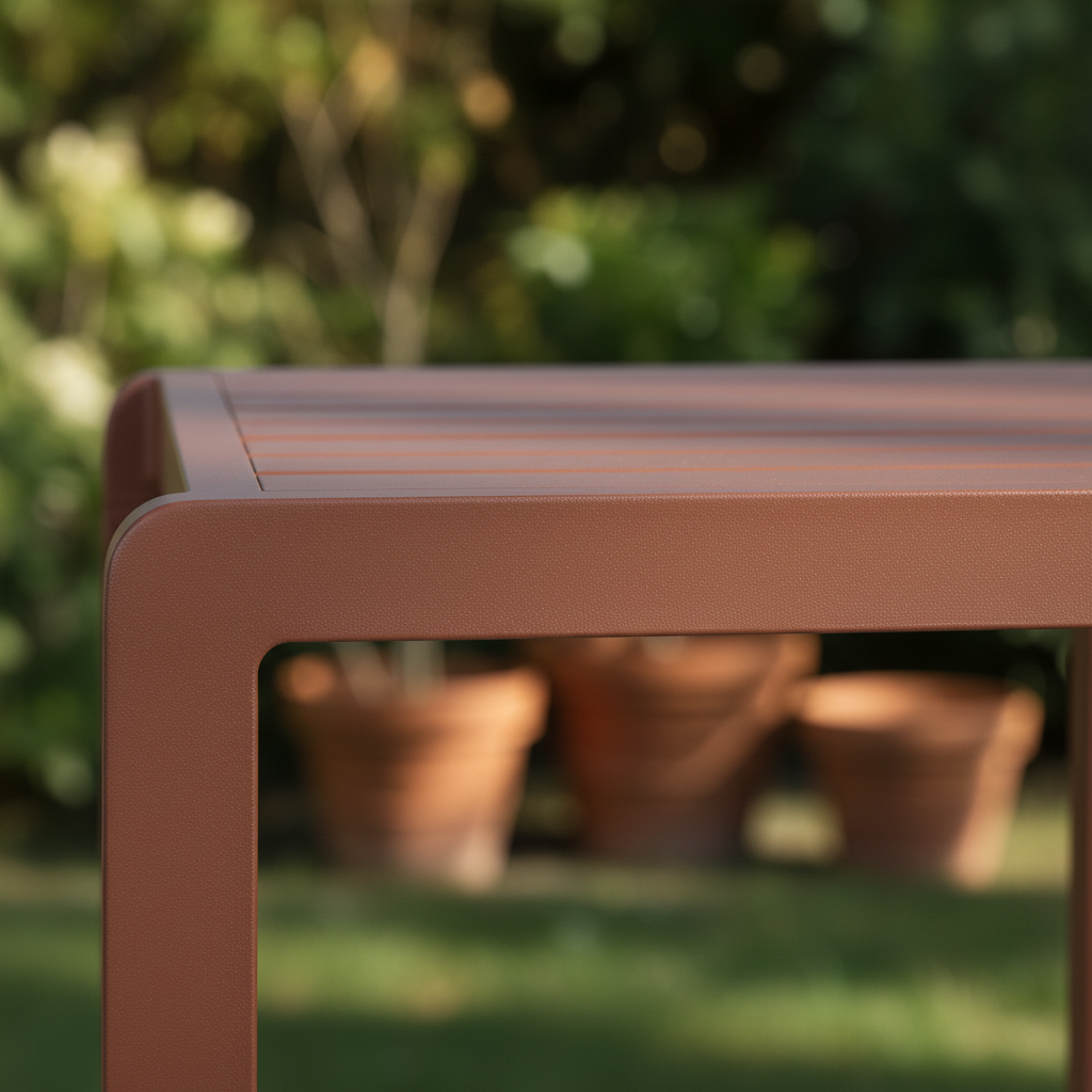 Alluminio verniciato a polvere color ruggine: leggero, resistente alla corrosione e agli UV. La verniciatura a polvere garantisce durata superiore alla verniciatura liquida nel tempo.