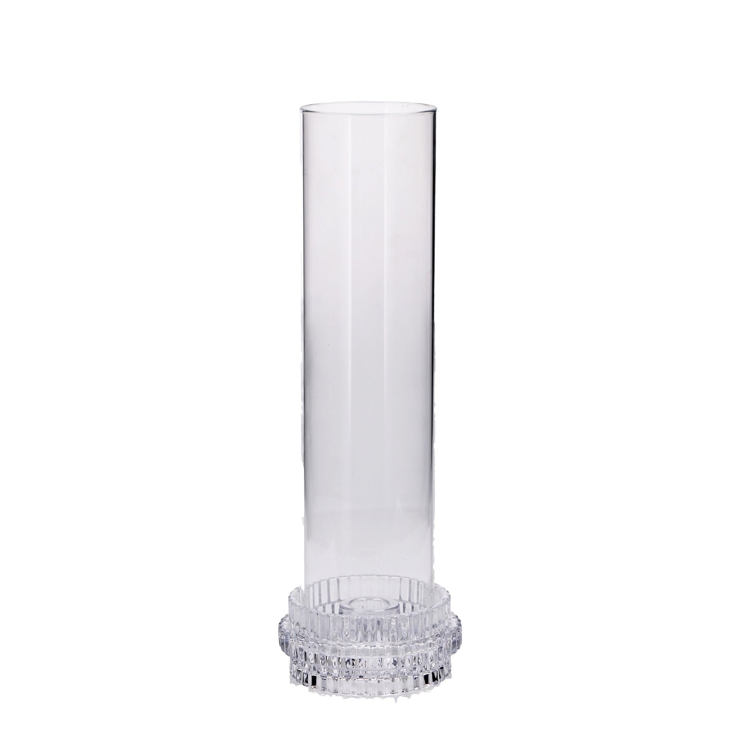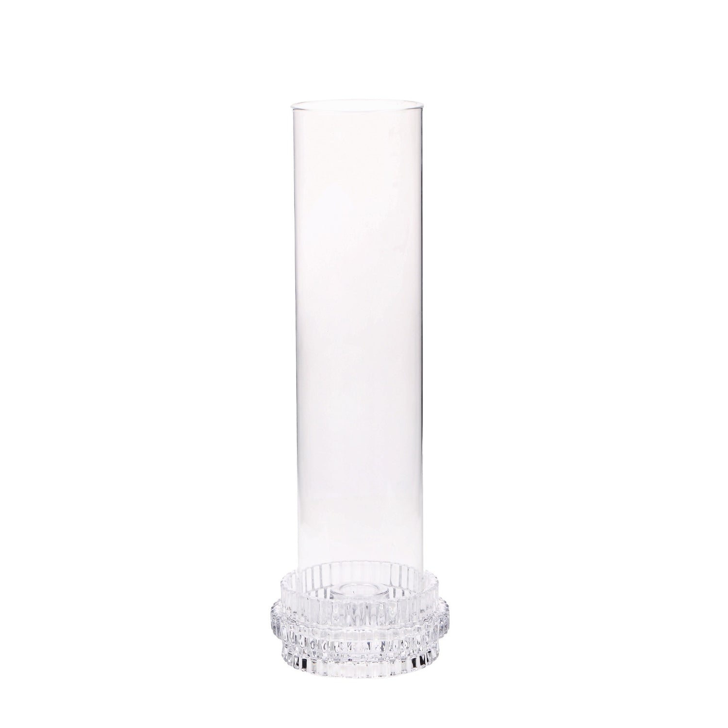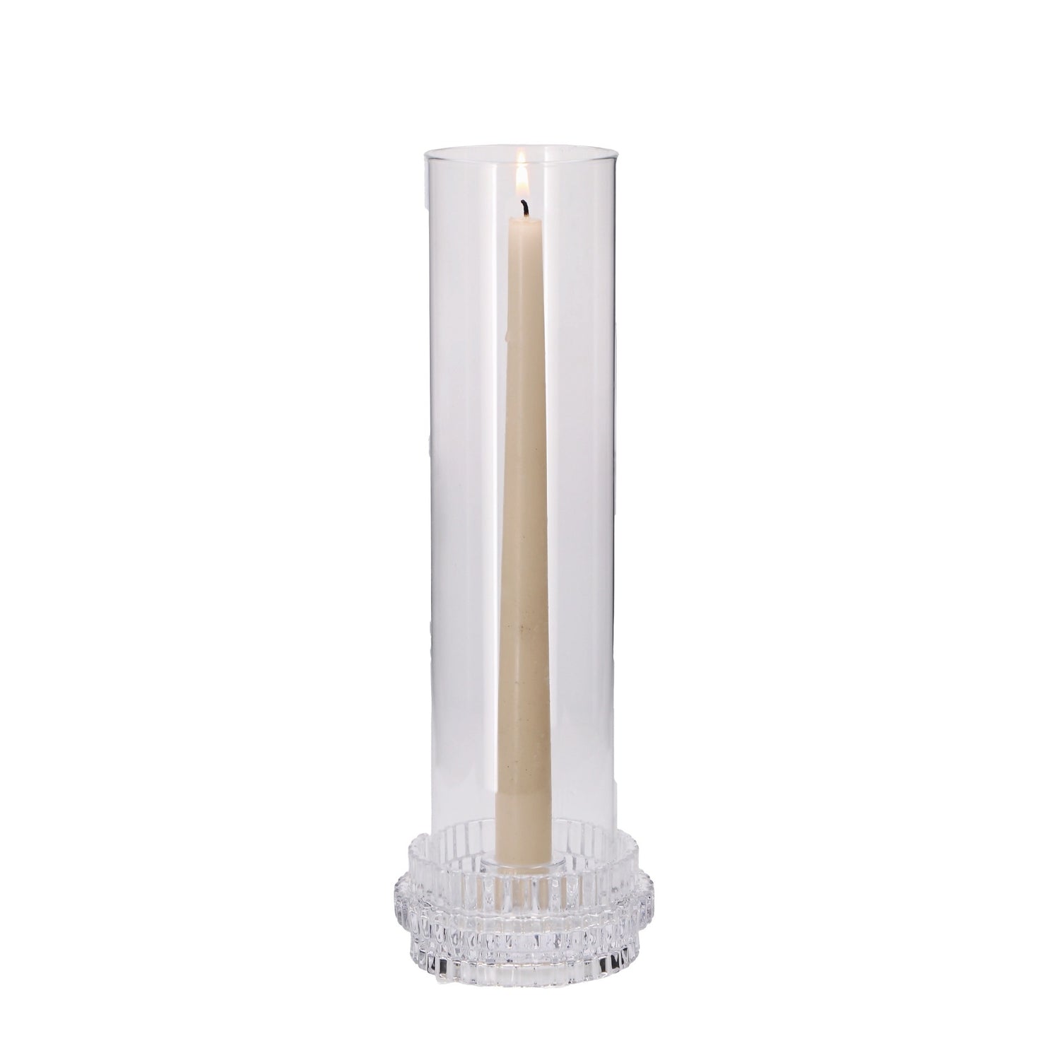 La sua forma alta e slanciata, con base decorativa lavorata, dona stabilità e raffinatezza all’oggetto, mentre il vetro trasparente esalta la luce della candela creando un’atmosfera calda e suggestiva. Ideale per decorare tavole eleganti, centrotavola, eventi, cerimonie o ambienti moderni.