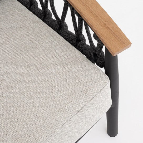 Struttura alluminio verniciato a polvere, braccioli effetto legno, corda Olefin 100% polipropilene, cuscini Olefin idrorepellente: materiali tecnici premium resistenti a UV, pioggia e uso outdoor intensivo nel tempo.