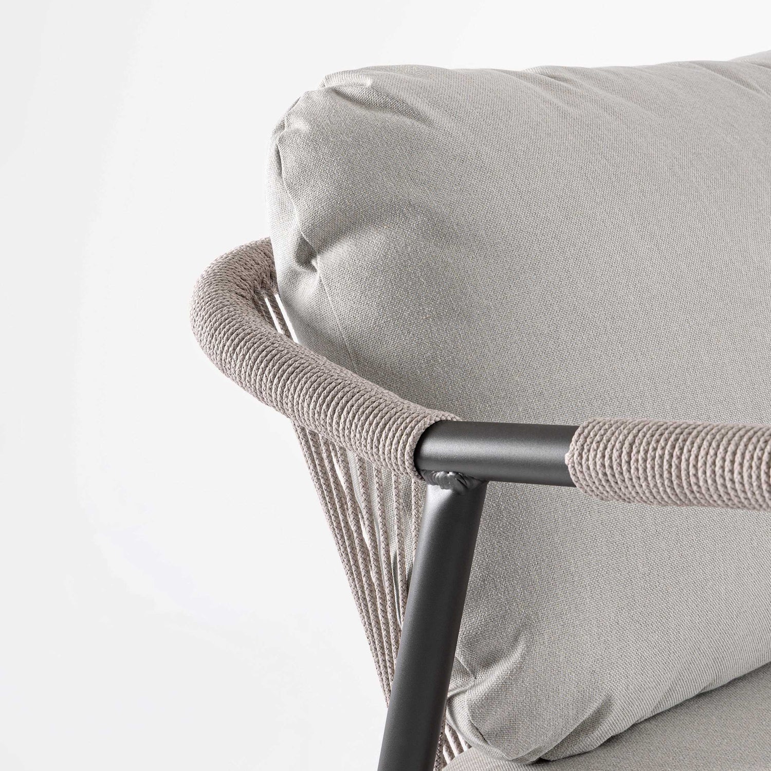 Pulire la struttura in alluminio con acqua e sapone neutro, asciugare subito. La corda in poliestere si pulisce con acqua tiepida e sapone neutro — no candeggina. Le fodere dei cuscini sono sfoderabili e lavabili. Il piano in pietra sinterizzata si pulisce con panno umido; non usare acidi. A fine stagione coprire o riporre al chiuso.