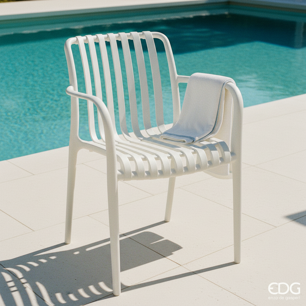 La Sedia Righe EDG Enzo De Gasperi in polipropilene bianco porta il design italiano su terrazze, giardini e spazi contract con portata fino a 120 kg e resistenza UV certificata. Struttura leggera e impilabile, pronta all'uso senza assemblaggio: ideale per chi cerca una sedia da esterno duratura con un colore neutro luminoso che si abbina a qualsiasi stile outdoor, dal minimal al mediterraneo.