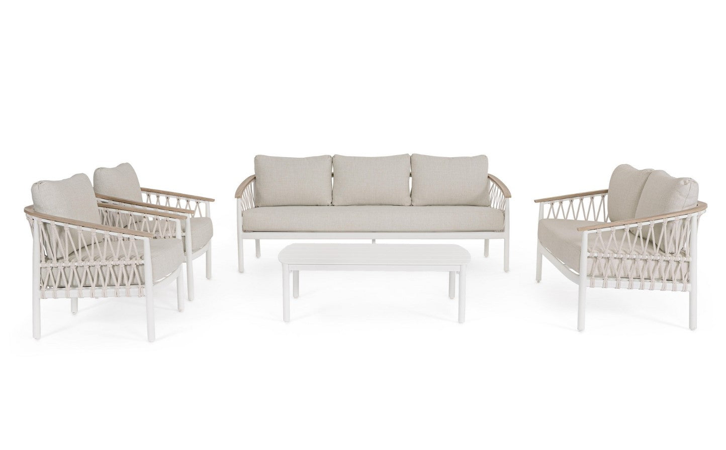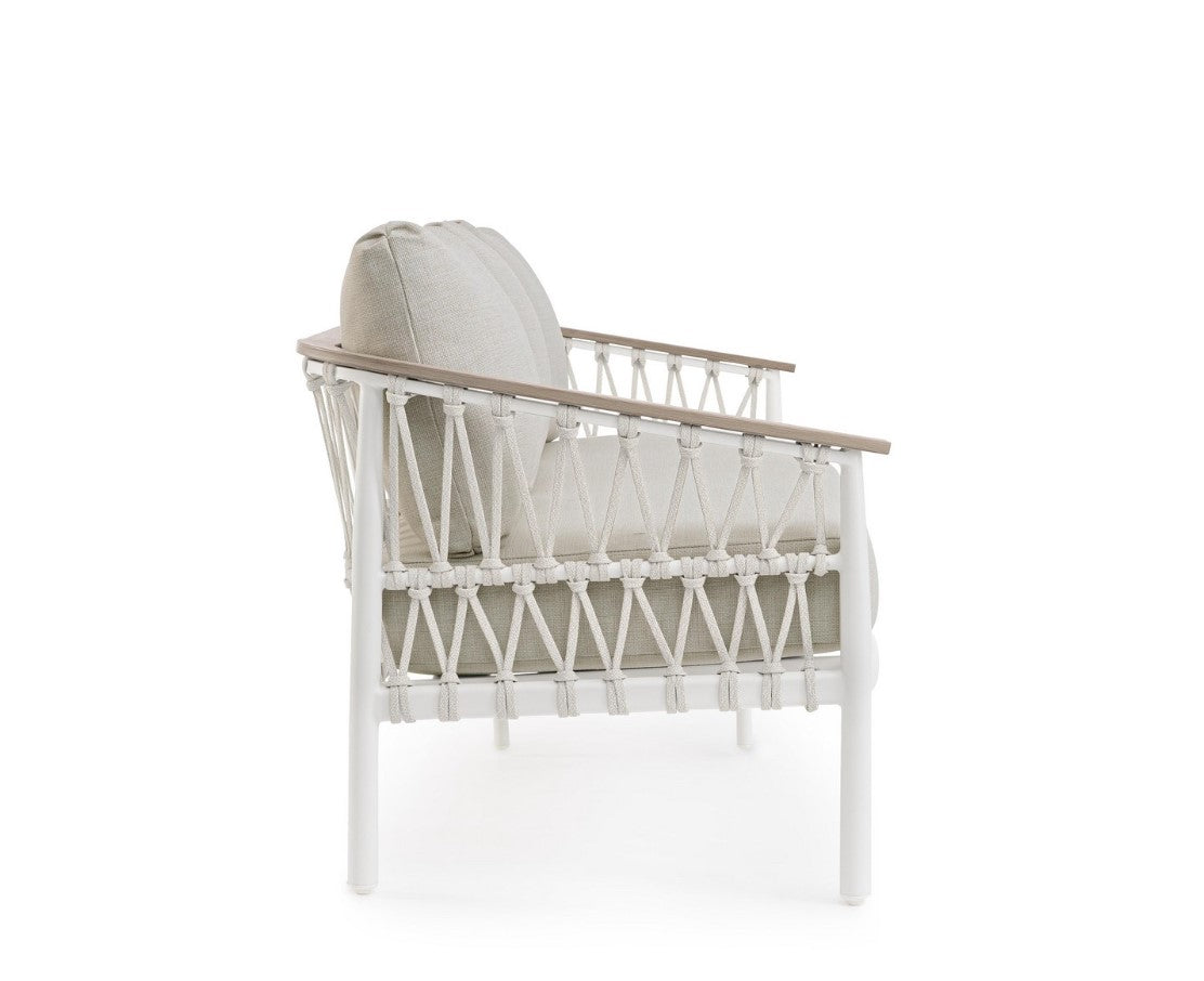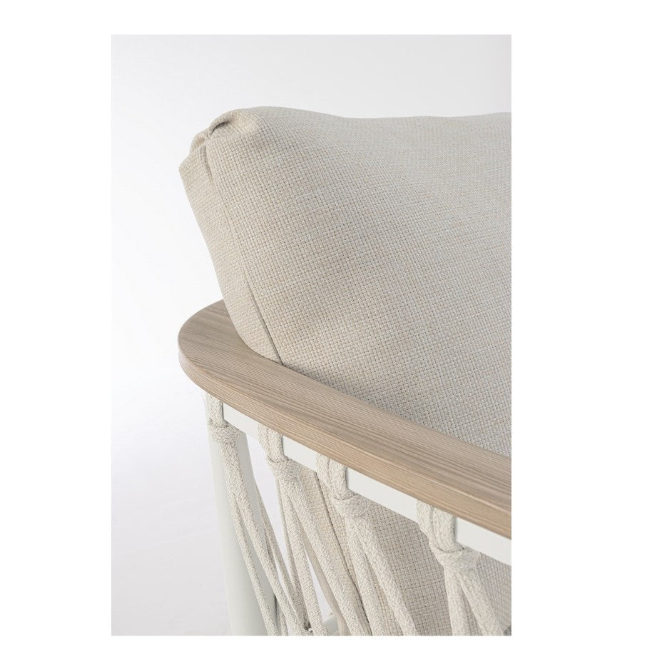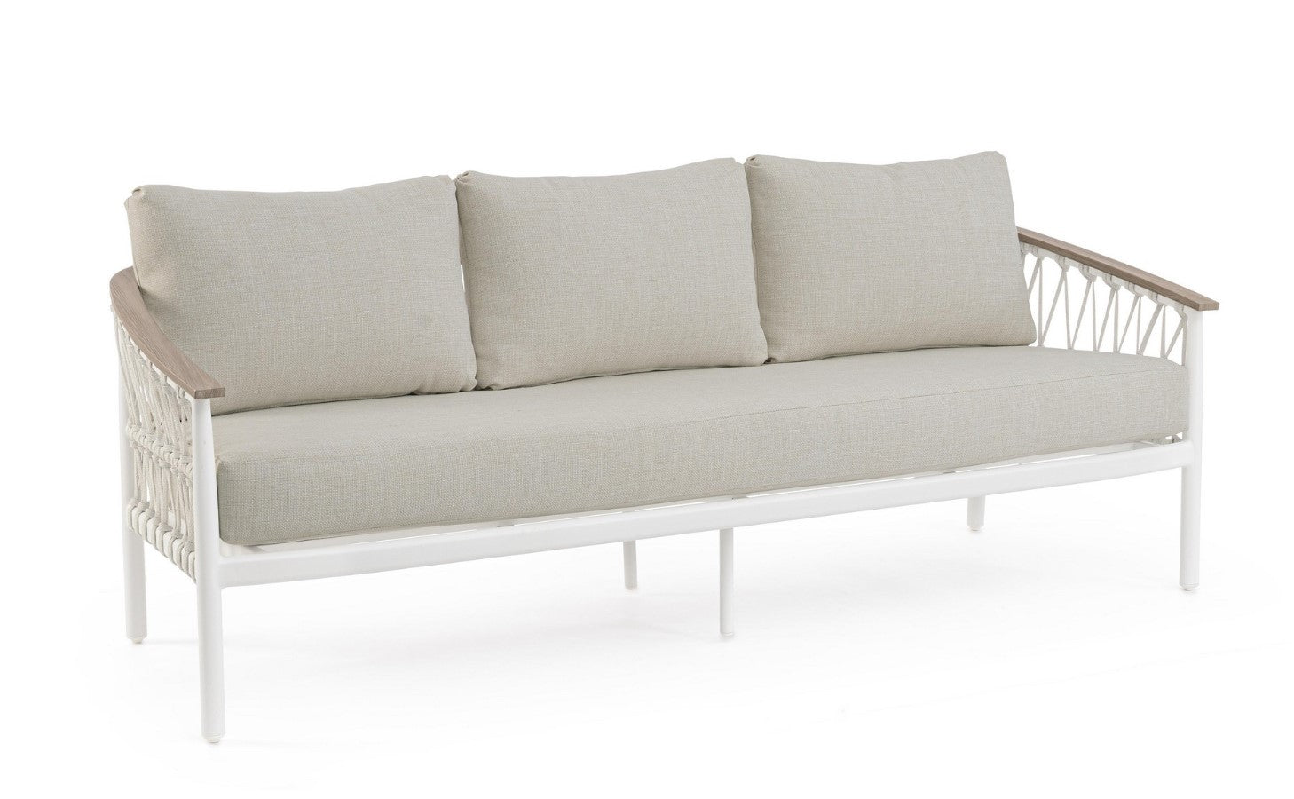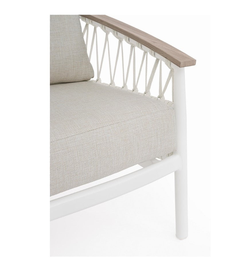La struttura in alluminio verniciato, abbinata ai braccioli effetto legno con intreccio in corda, conferisce al divano uno stile raffinato e una grande resistenza agli agenti atmosferici. I cuscini sfoderabili in tessuto tecnico idrorepellente garantiscono comfort e praticità d’uso quotidiano.