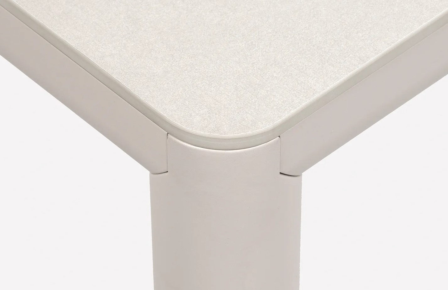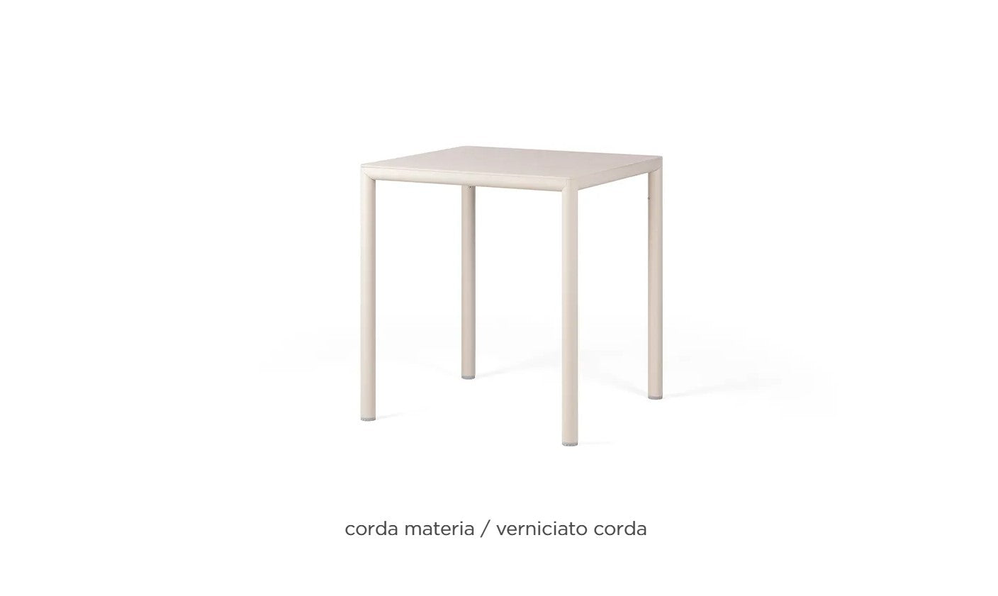 Die Konstruktion besteht aus lackiertem Aluminium mit rundem Querschnitt – einem leichten, robusten Material, das sich perfekt für den Außenbereich eignet. Die matte Oberfläche in der Farbe „Corda“ verleiht dem Tisch ein natürliches, helles und elegantes Aussehen, das sich leicht mit verschiedenen Outdoor-Stuhlkollektionen kombinieren lässt. Die verstellbaren Füße sorgen für einen perfekten Stand auch auf unebenen Böden, wodurch sich der Tisch ideal für den intensiven gewerblichen Einsatz eignet.